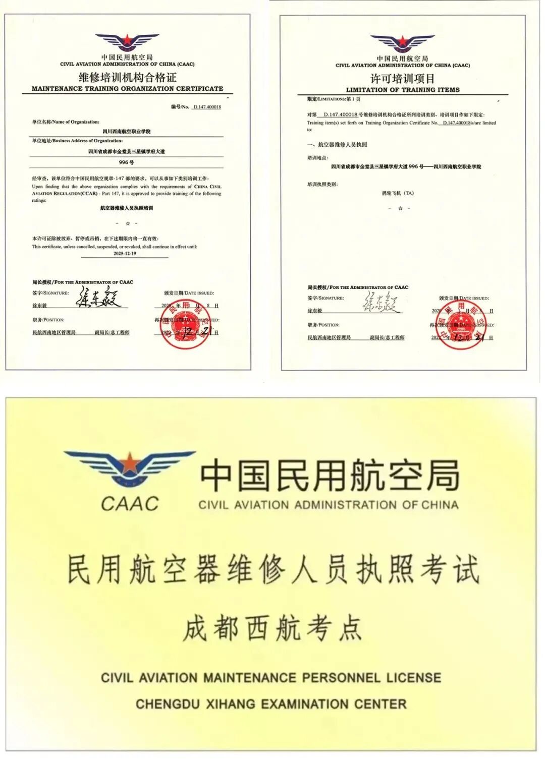 西南航院CCAR-147培训中心是经过民航西南管理局和民航四川监督局两家权威机构的联合验收,经专家评估,具备较好的软硬件办学条件的民航维修人员技能培训机构,并内设有民航维修人员执照考点。培训中心培训设施设备为国内一流水平,实训基地总面积2000多m2;购置有一架波音737-300客机用于实践教学;建有飞机发动机拆装与调试实训室、2D飞行模拟仿真实训室、紧固件保险实训室、管路拆装实训室、飞机附件分解实训室和电工电子实训室、机械工程实训室;以及先进的理论电化教室。