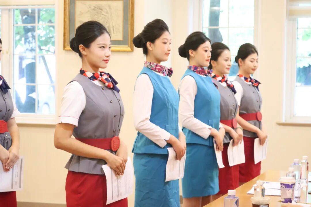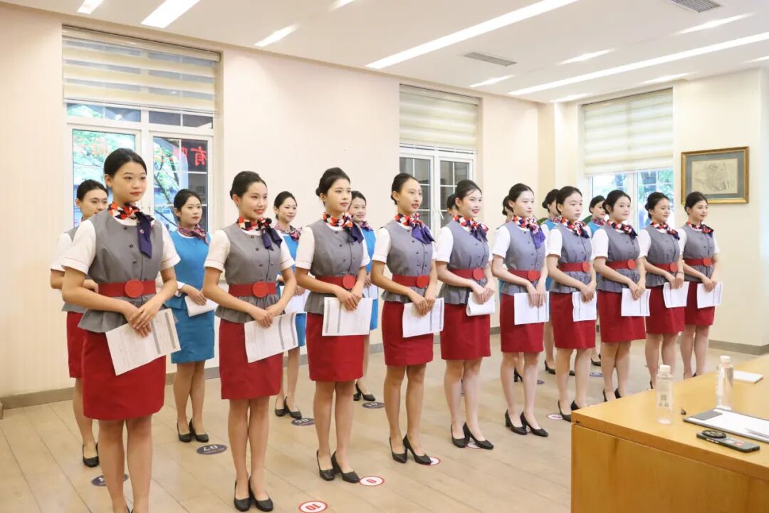 或是相互整理着装,或是修补妆容、调整发型,或是默默背诵精心准备的自我介绍,或进行表情管理练习……对细节的极致追求,正是空乘职业素养的初步体现,也彰显了在标准化军事化管理下职业化塑造取得的显著成效。
