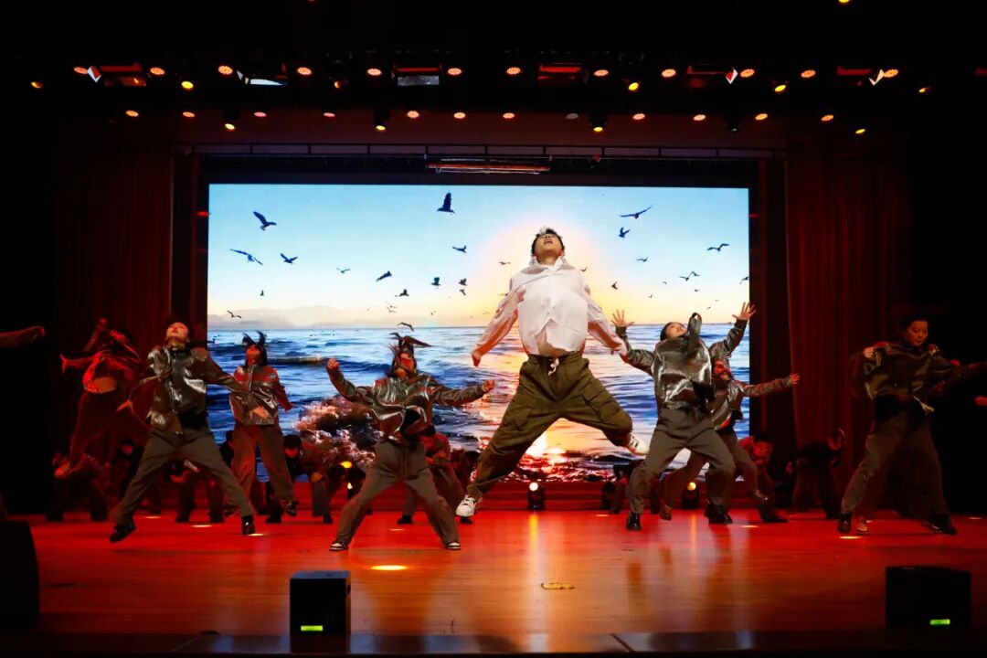 《爵色魅影》空中乘务学院指导老师:张文玥 樊璐,爵士的节奏与青春的活力碰撞,舞步洒脱,转身惊艳,瞬间点燃了全场的热情。紧接着,在灯光下,她们以身体诉说前行,步履坚定,向光而行,赋予每个人内心生长的力量。