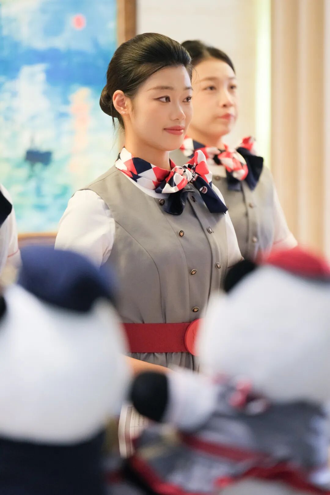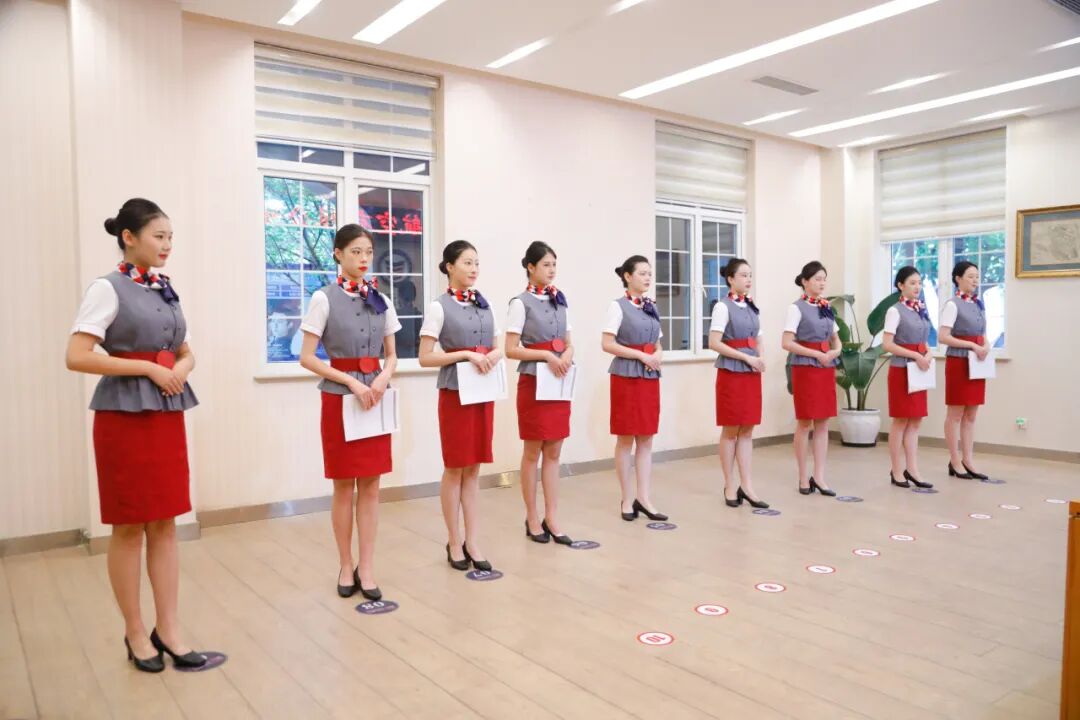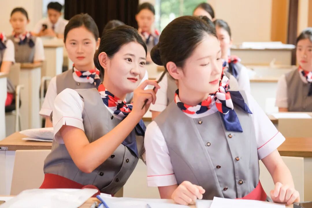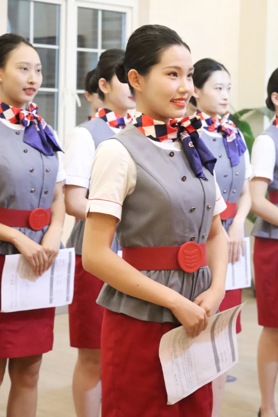 或是相互整理着装,或是修补妆容、调整发型,或是默默背诵精心准备的自我介绍,或进行表情管理练习……对细节的极致追求,正是空乘职业素养的初步体现,也彰显了在标准化军事化管理下职业化塑造取得的显著成效。