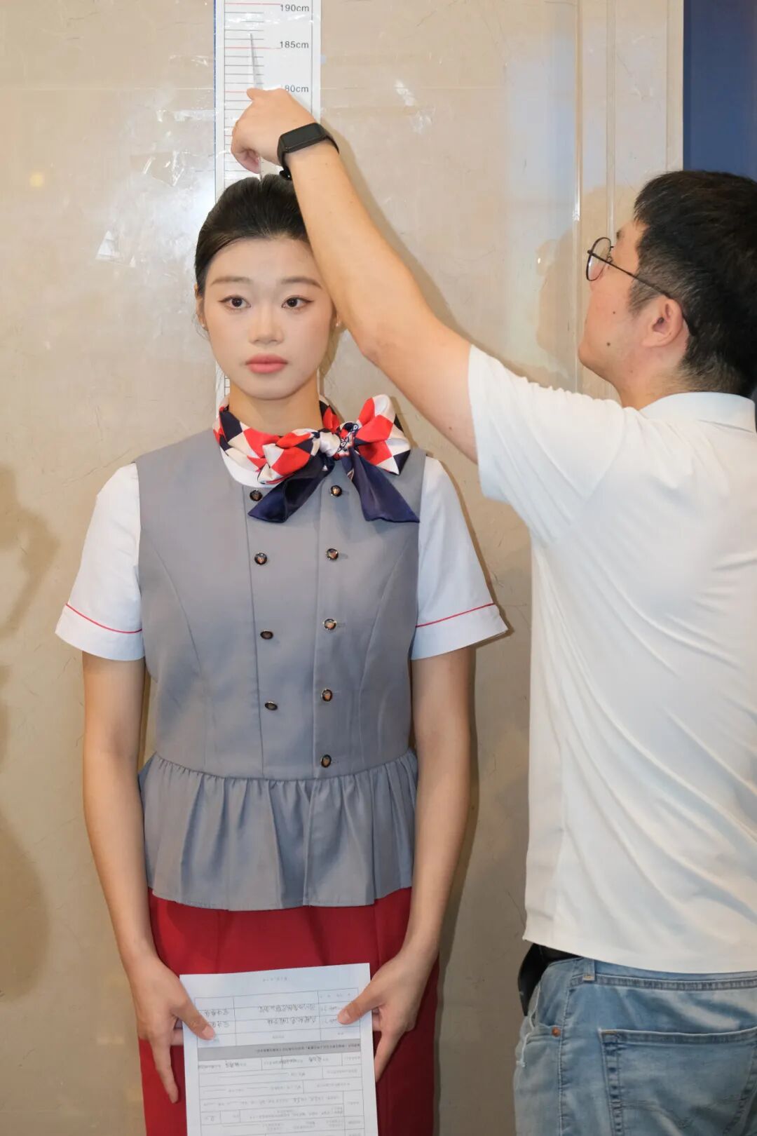 身高体重测量是乘务员、安全员招聘的硬性标准之一,海选则综合考量了同学们的职业形象、仪容仪表、站姿体态以及面部表情等细节,达到标准线的同学们方可获得初试的“入场券”。